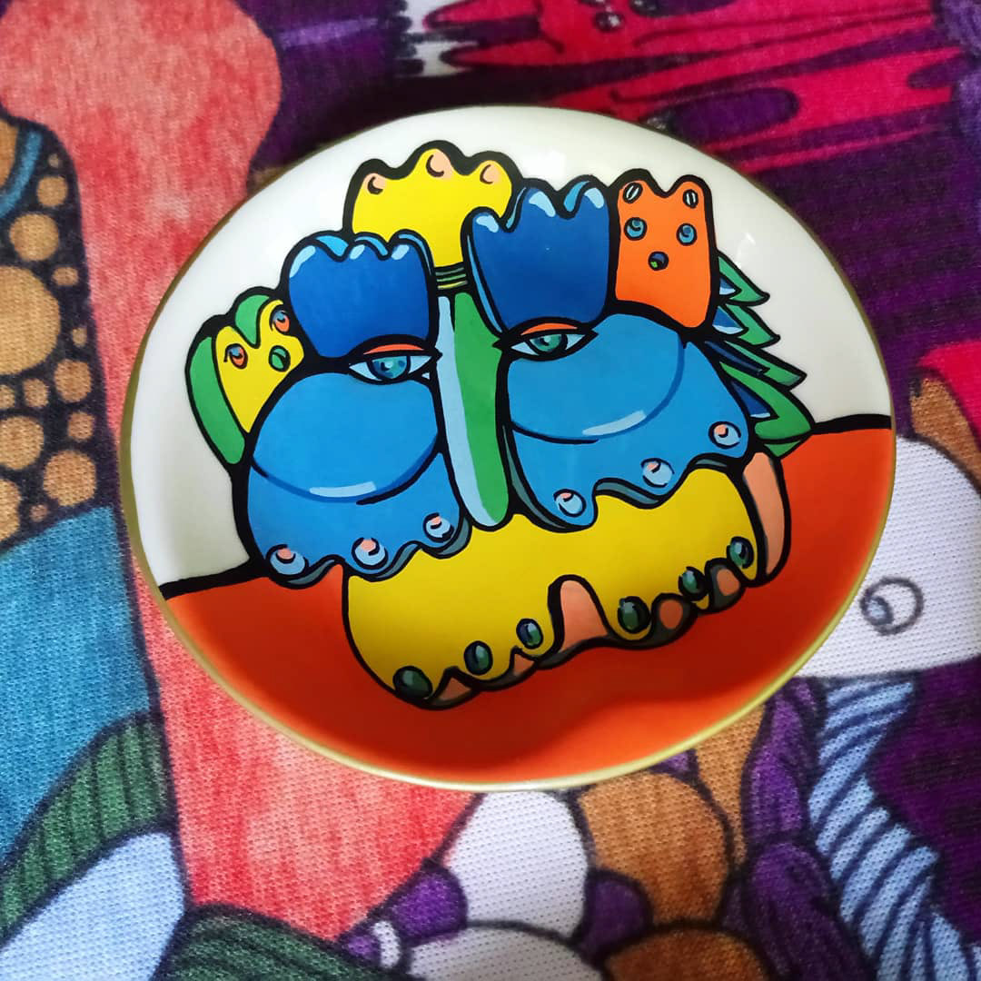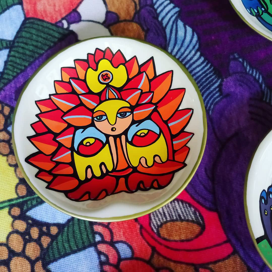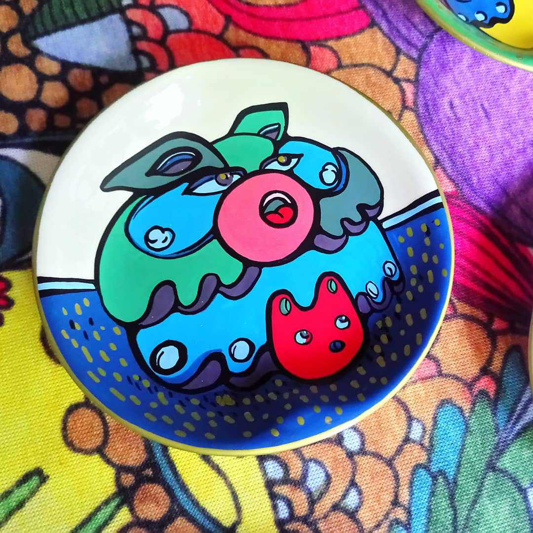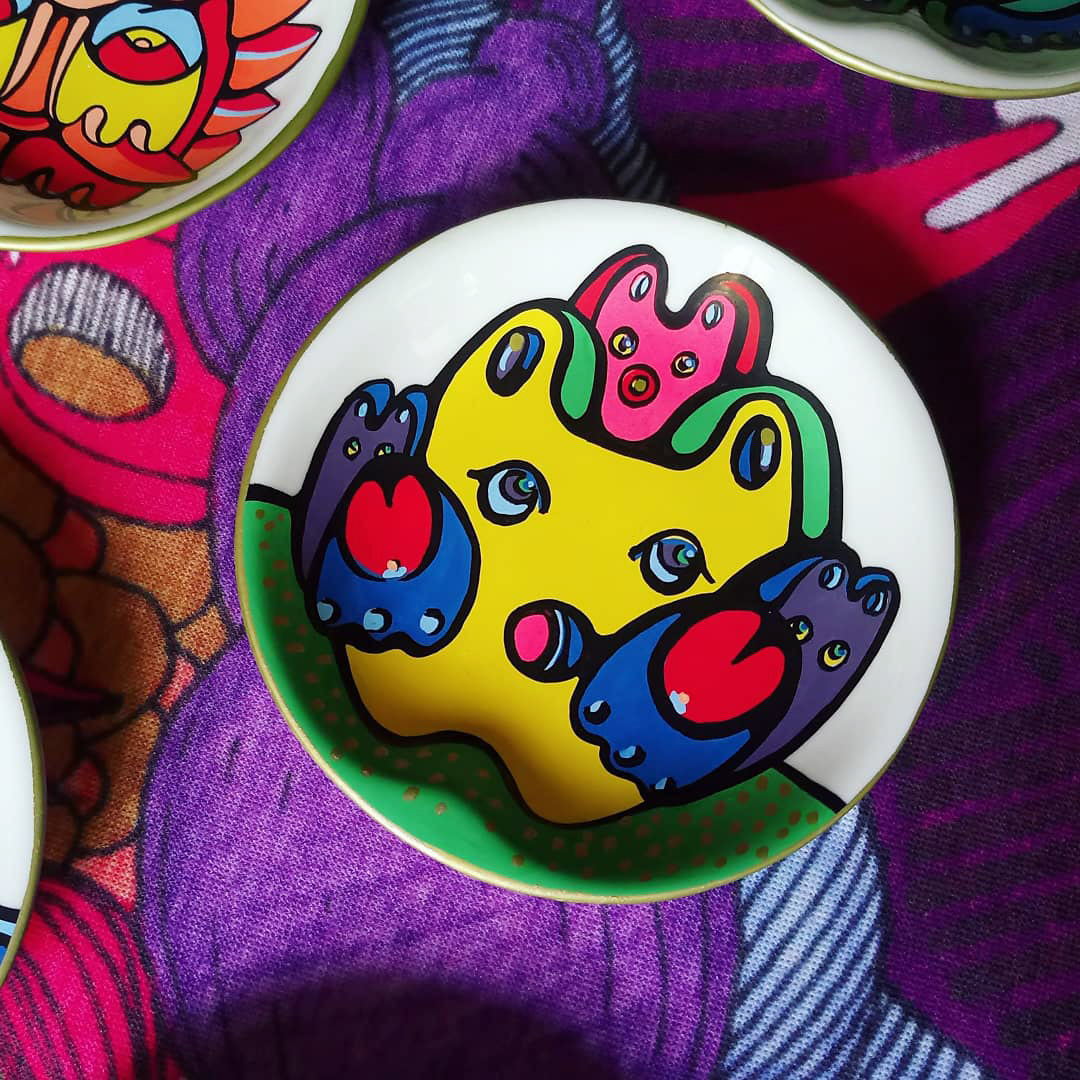 Acrylic, porcelain, 2018 Series of tiny hand-painted decorative plates.