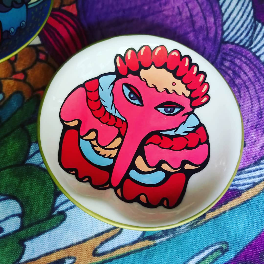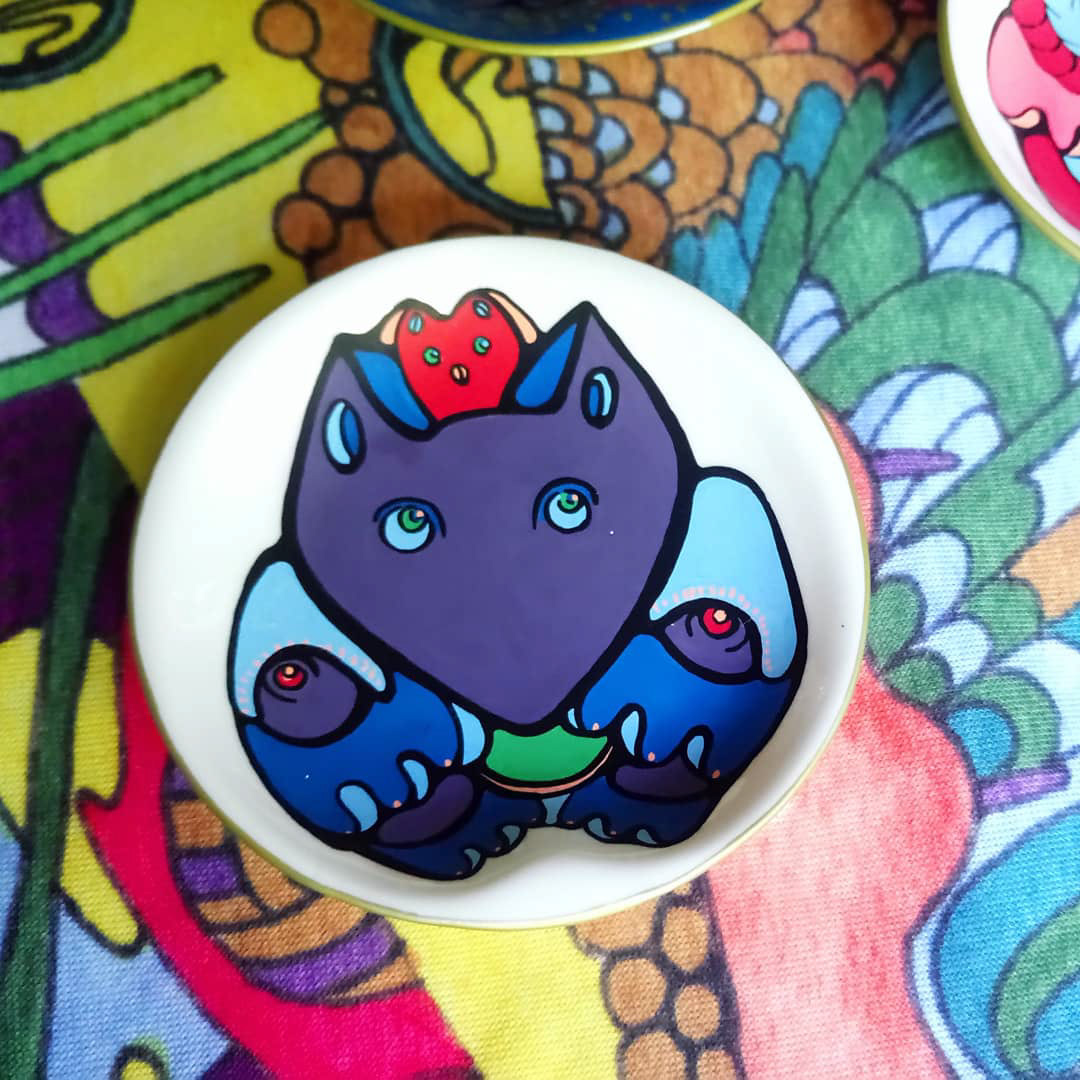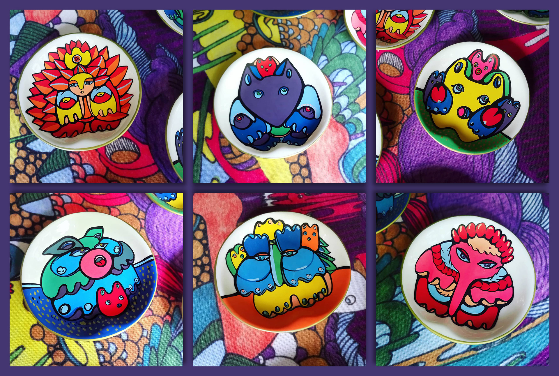 Acrylic, porcelain, 2018 Series of tiny hand-painted decorative plates.