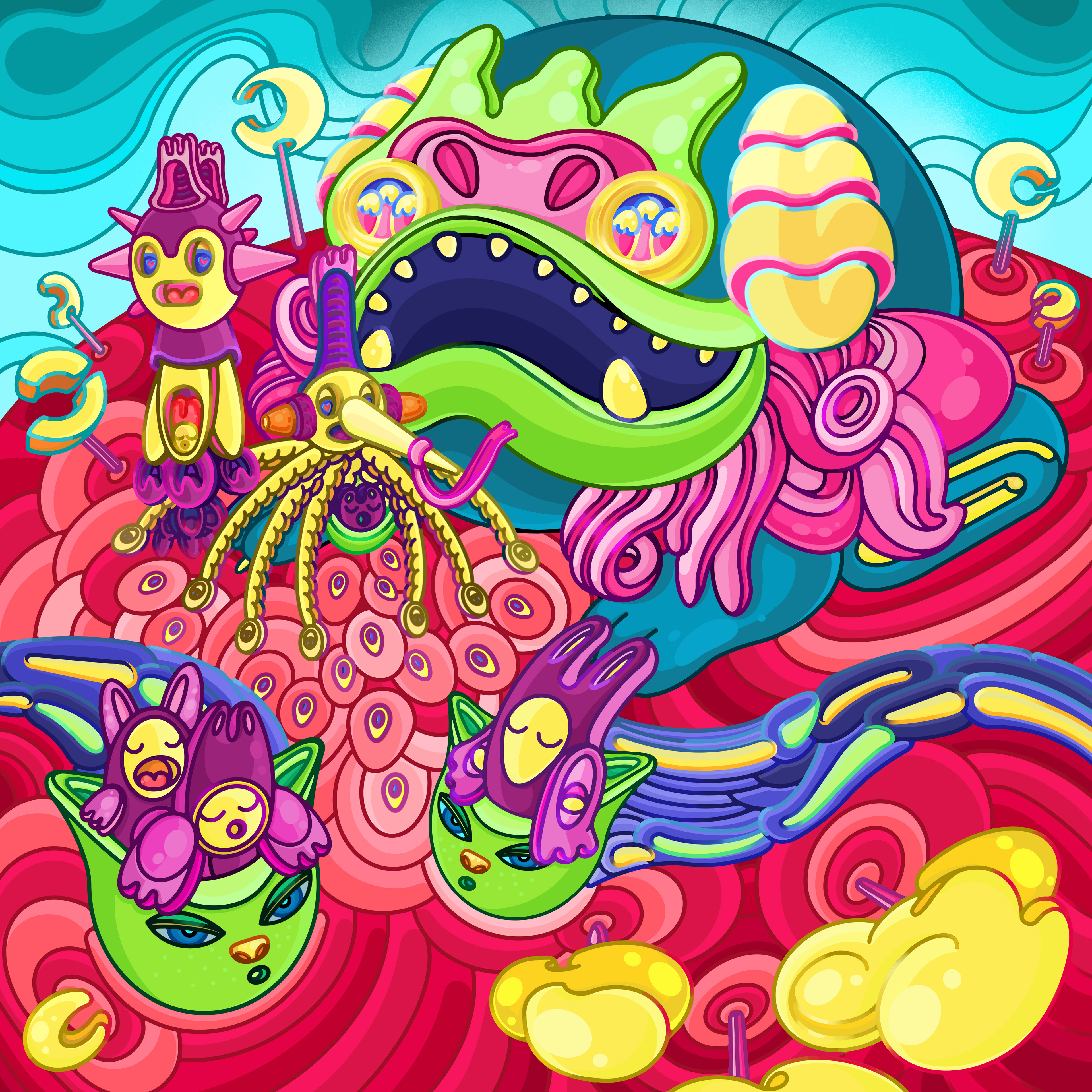 Illustration, CGI Hares ride in cat's boats on boundless rivers and seas, a toad with a bottomless mouth exhales air and cheerful lanterns circle around.