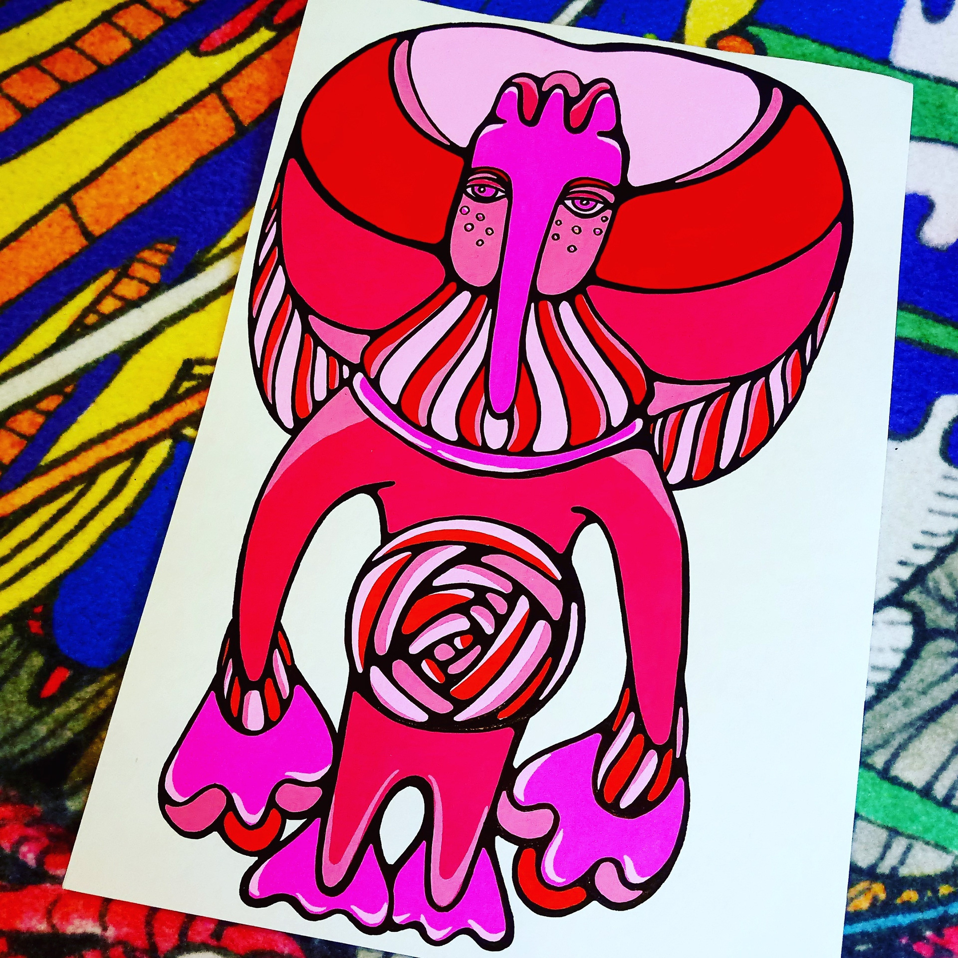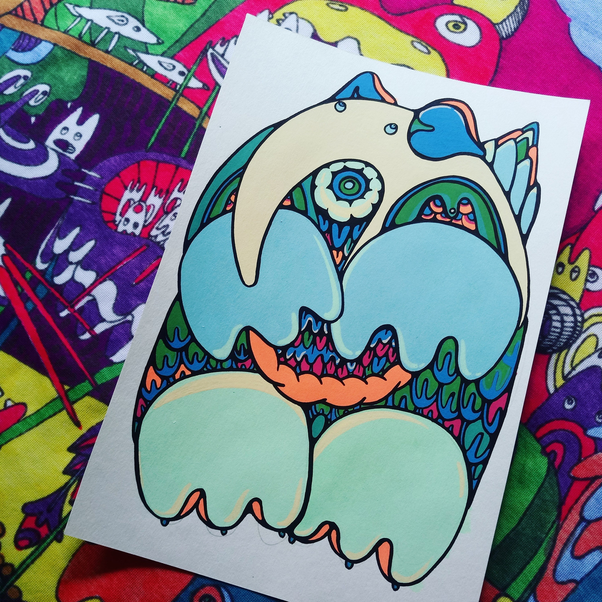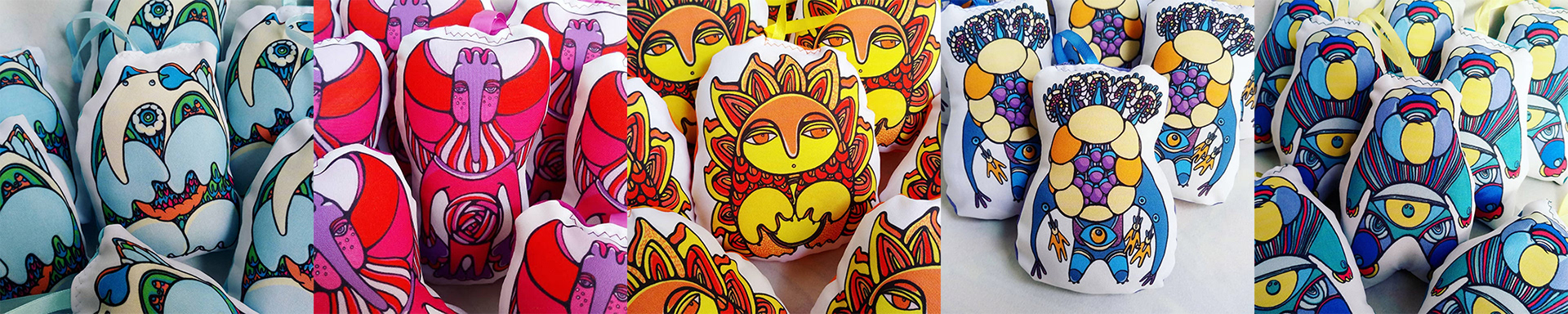 Acrylic, cga, textile, 2019 A series of bright characters for small fabric souvenirs
